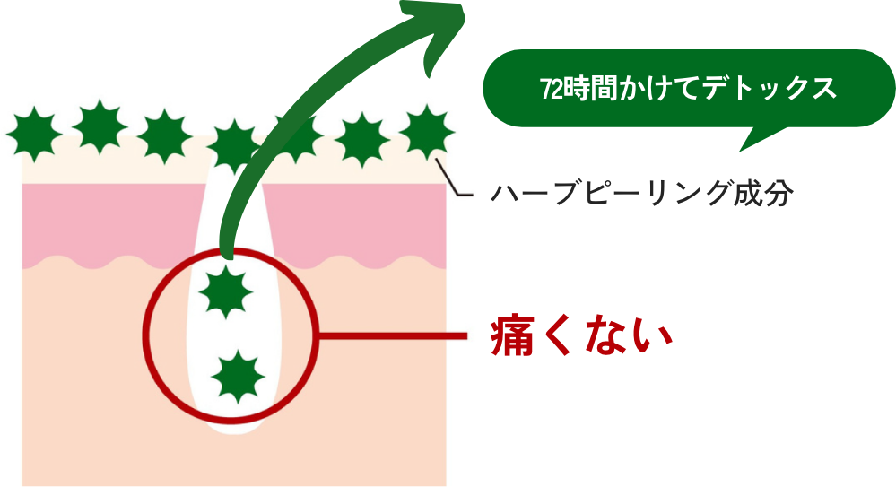 生薬ベースの有効成分を浸透させることで肌細胞を活性化。炎症の根源に働きかけ、ターンオーバーを促進、肌に不要な菌を72時間かけて殺菌、デトックスしていきます。ピーリングという名称ではありますが、剥離させることを目的とせず、肌の基礎を育て、整えていくトリートメント方法です。