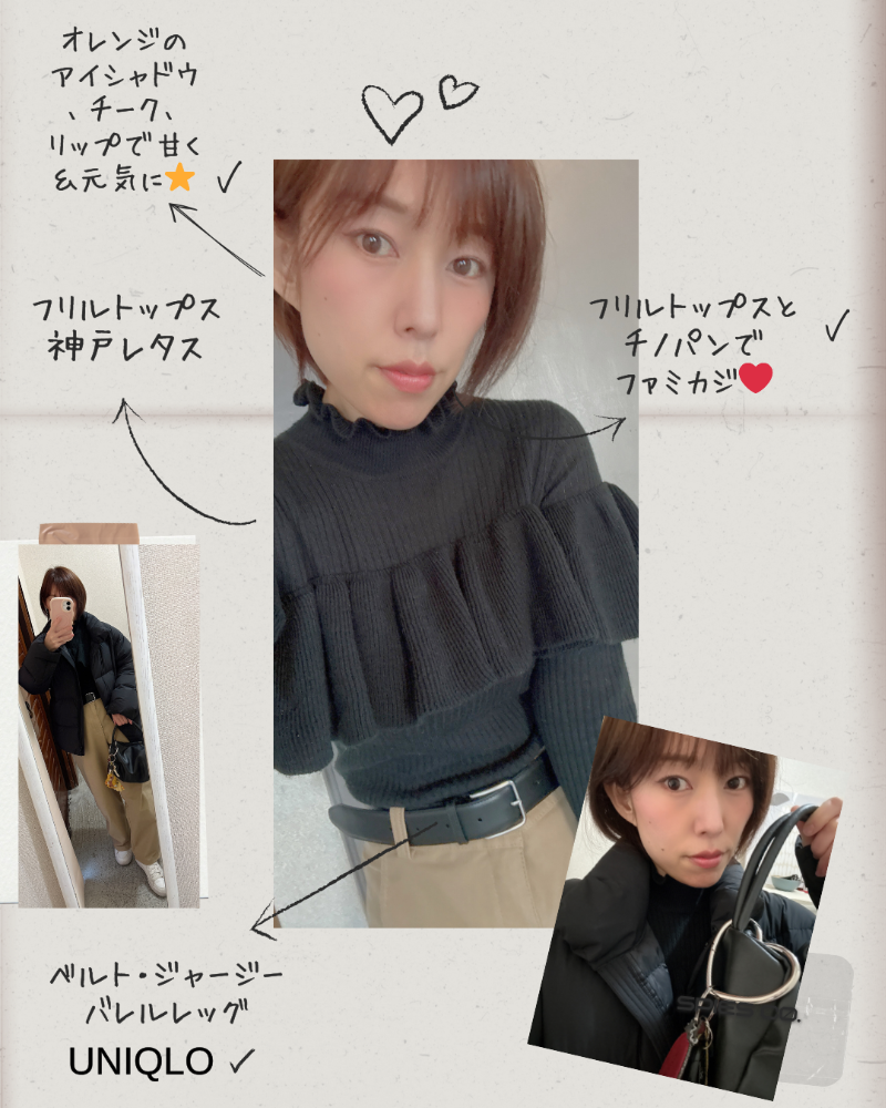 今日は神戸レタスのフリルニットトップスに、ユニクロのジャージーバレルレッグパンツを合わせて、フェミカジに🥰